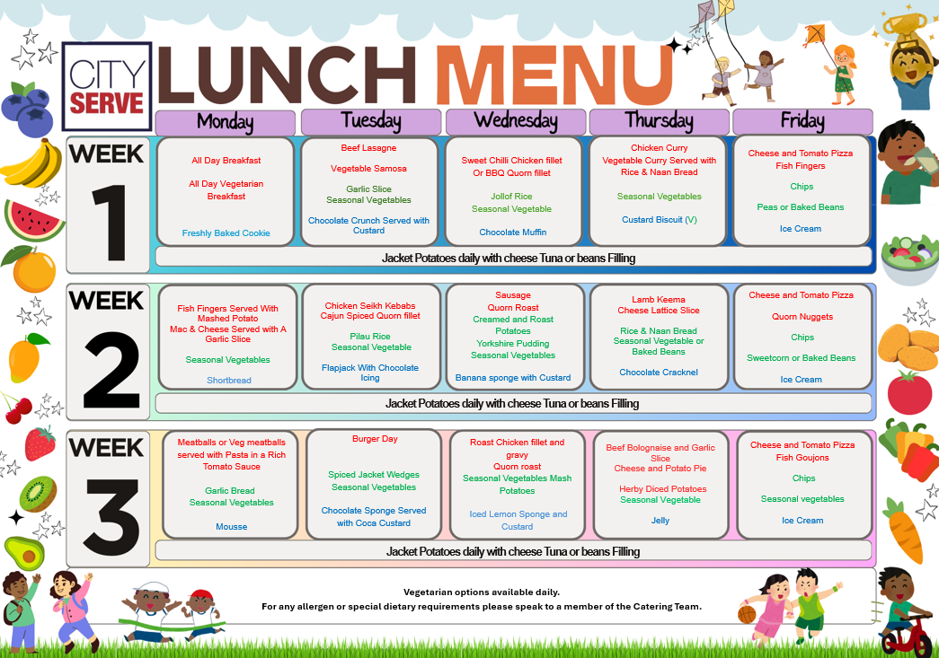 Cityserve is committed to providing high-quality, freshly prepared meals that meet the School Food Standards and support the health and wellbeing of every child. Their menus are carefully designed to be balanced, varied, and appealing, ensuring that children receive the essential nutrients they need to thrive both in and out of the classroom.