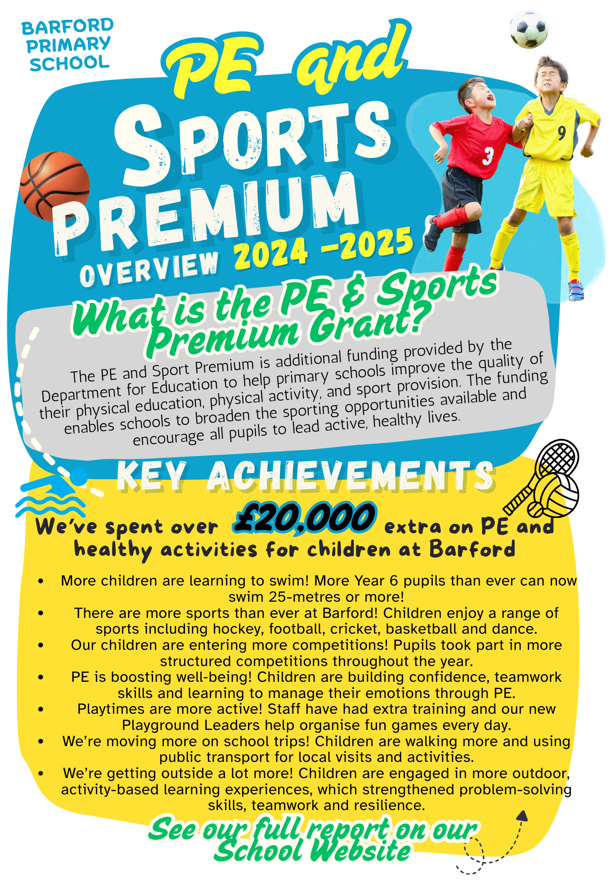 At Barford Primary School, we aim to provide our children with a positive experience of physical activity, a strong understanding of health and well-being and opportunities to take part in competitive sport. This is achieved through a wide range of sports and physical activity as part of our carefully planned PE curriculum and an extensive extra-curricular club program. We believe that a combination of high quality physical education, active participation in clubs and carefully managed and modelled competitive sport can benefit every child. It improves children’s health and fitness, builds character and confidence, embeds values such as fairness, teamwork and respect and ultimately develops essential life skills.